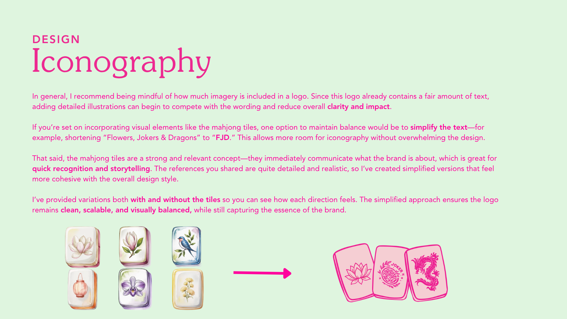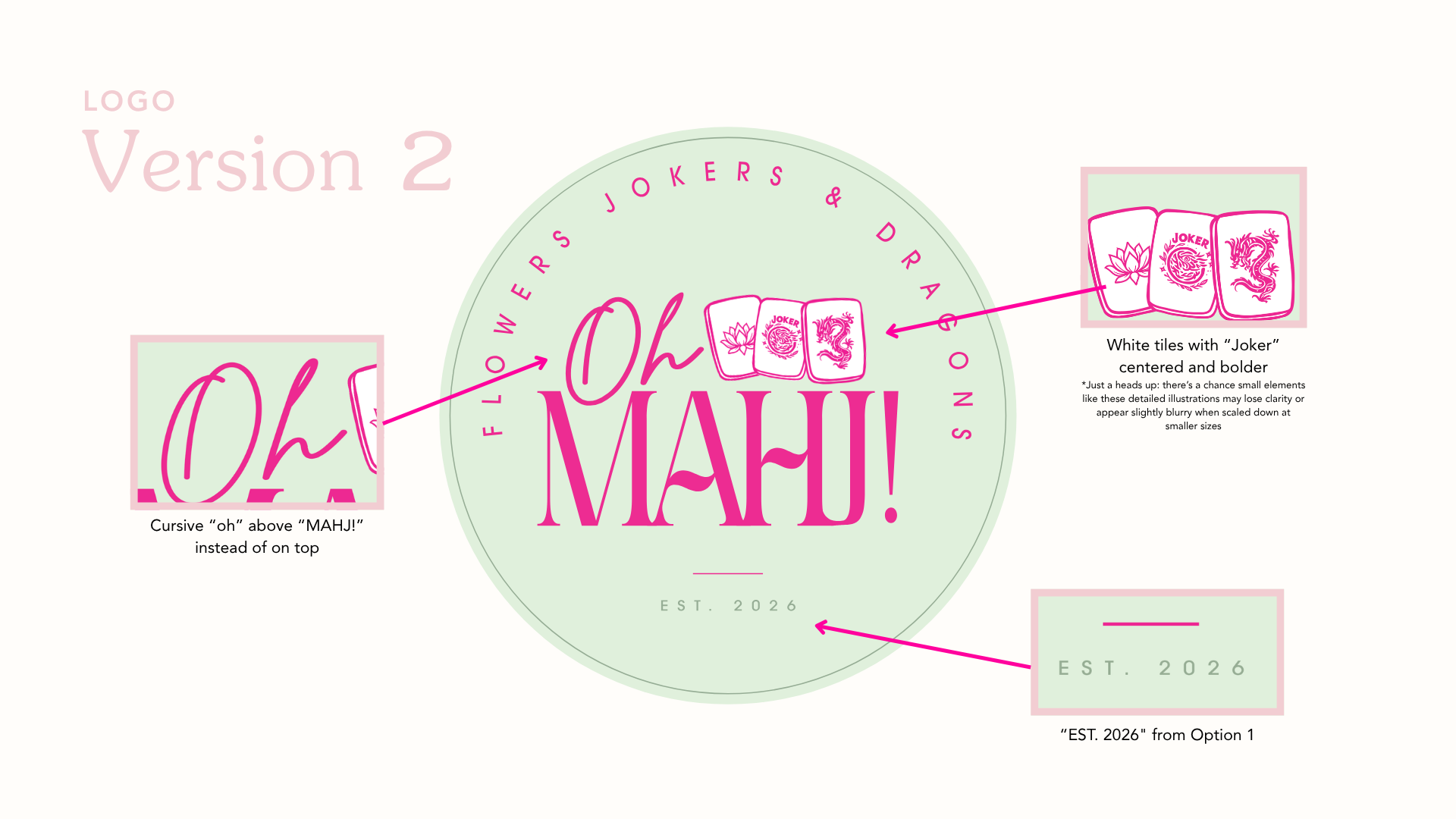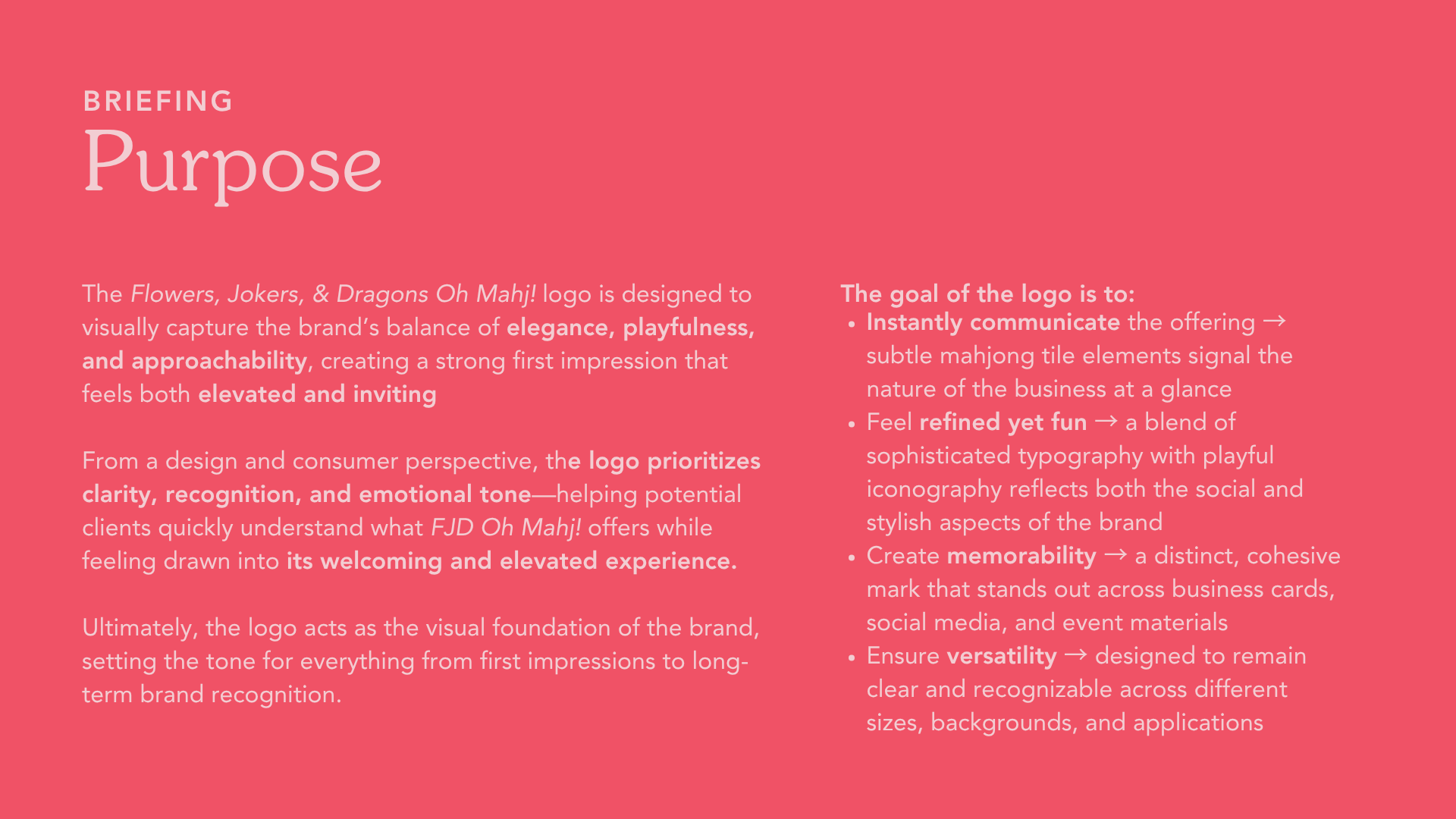 This project focused on building a flexible and recognizable brand identity for a modern, community-based mahjong group offering lessons, events, and social experiences. I translated the client’s vision into a cohesive system by exploring tone (playful vs. refined), visual hierarchy, and usability across touchpoints.