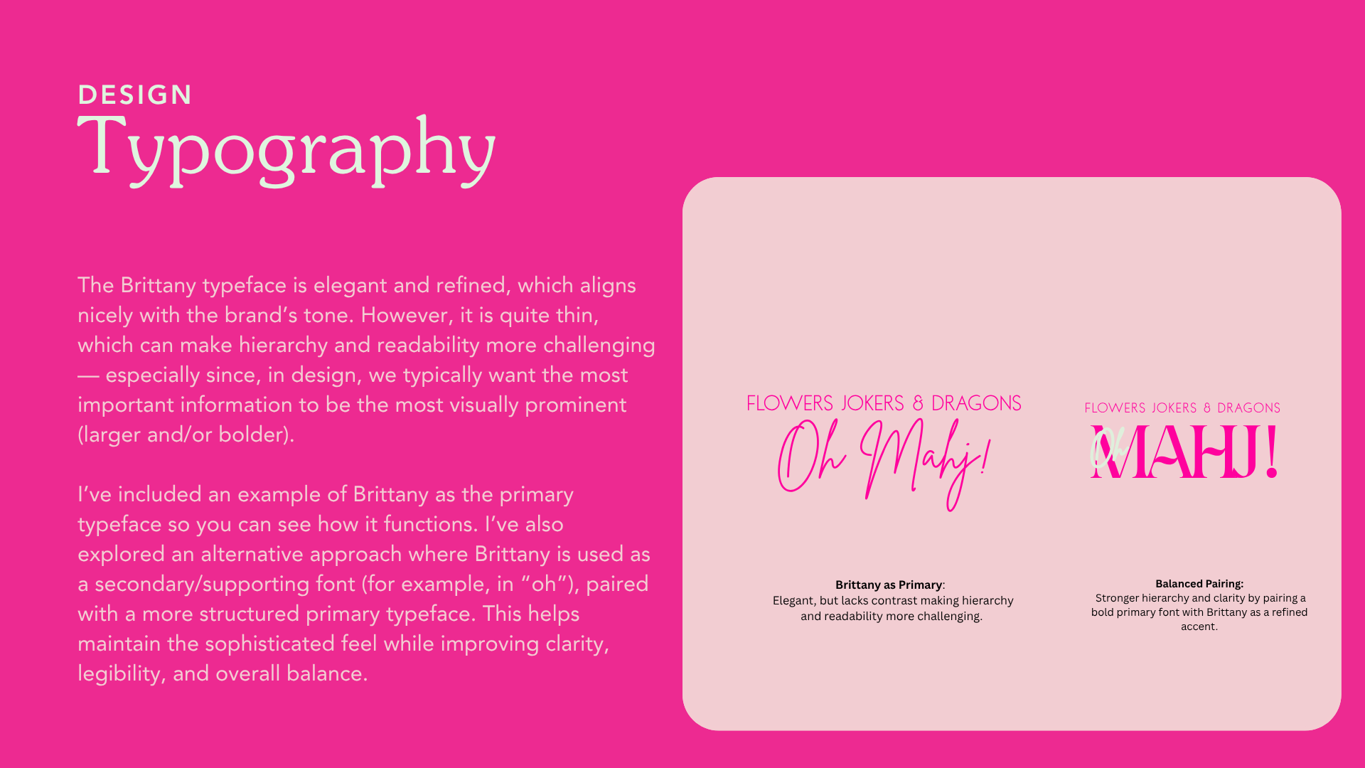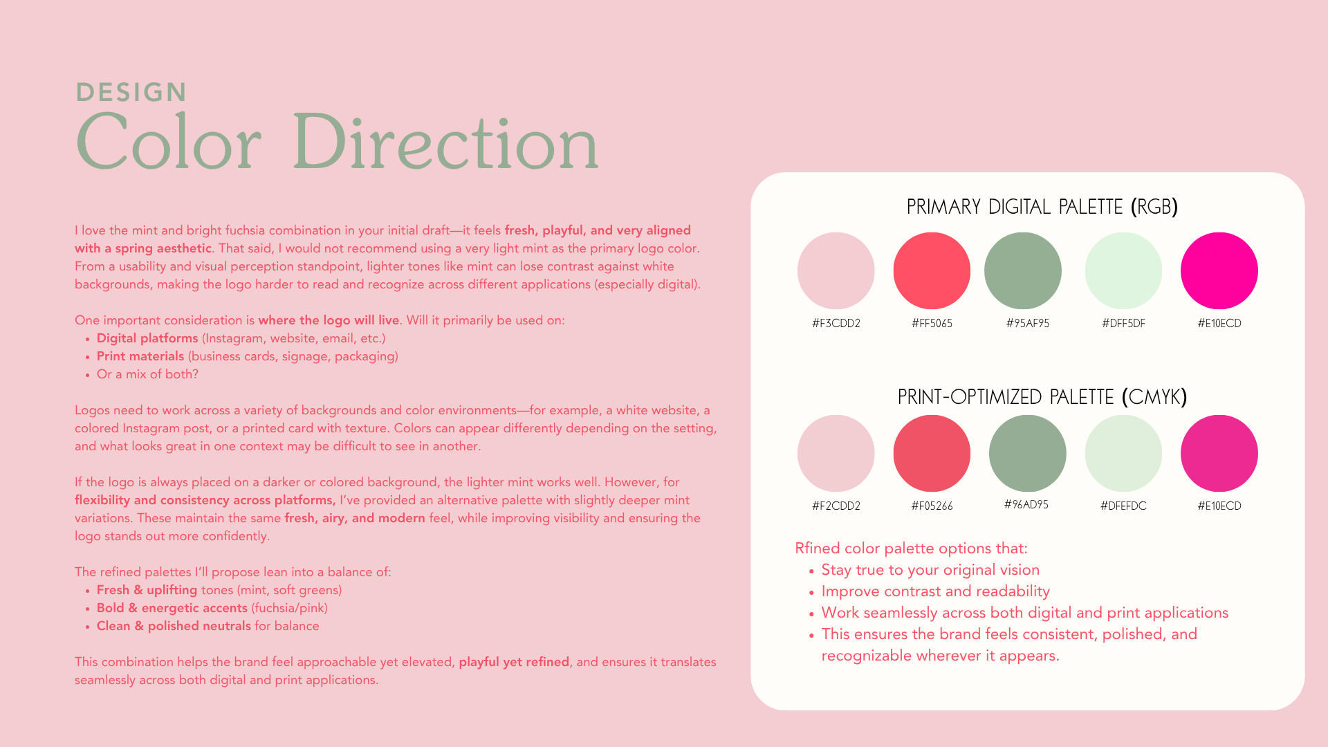Key considerations included contrast and accessibility in color selection, typography pairing for clarity, and simplifying detailed iconography for scalability. The final direction balances personality and polish, designed to perform across social media, business cards, and event materials.
