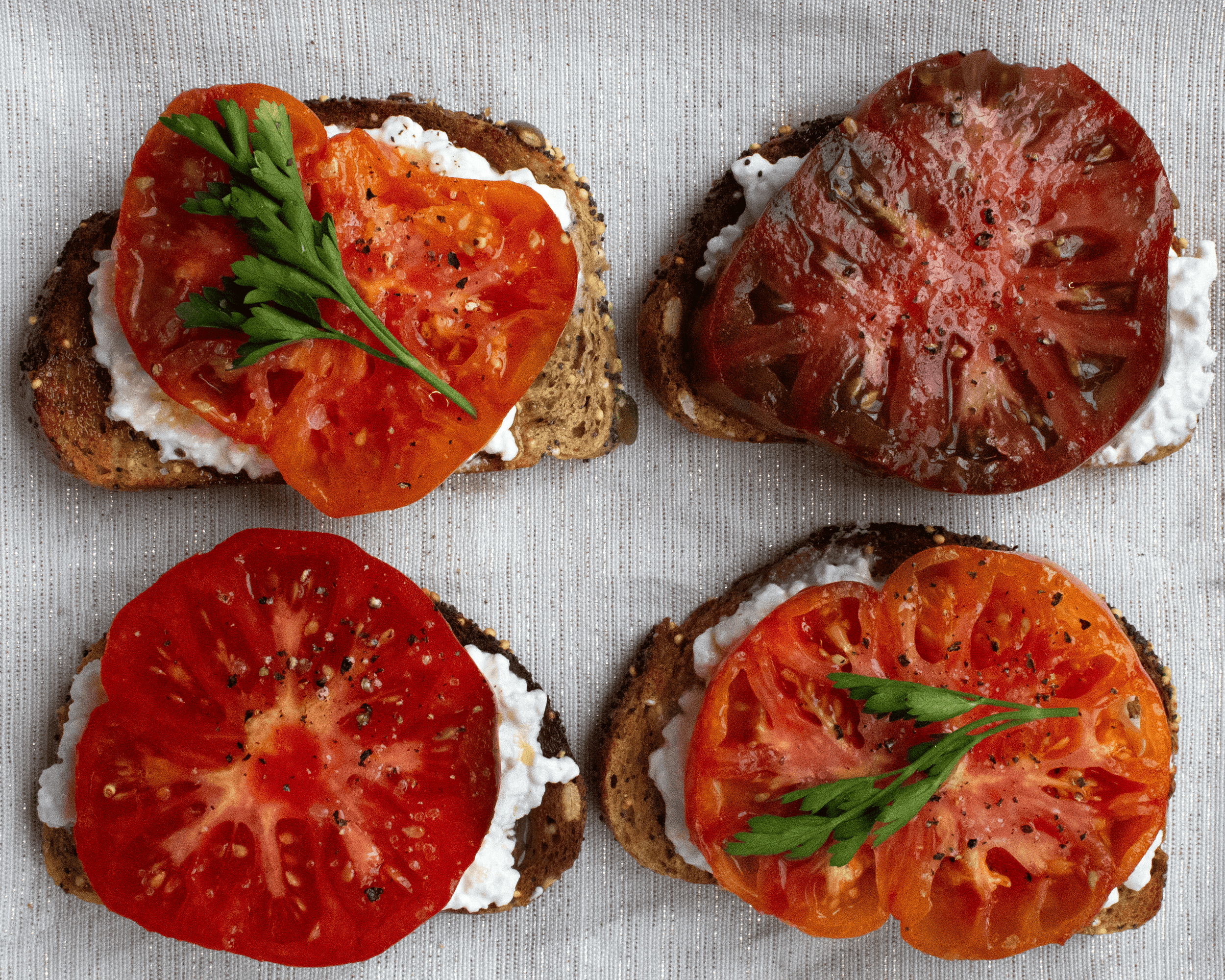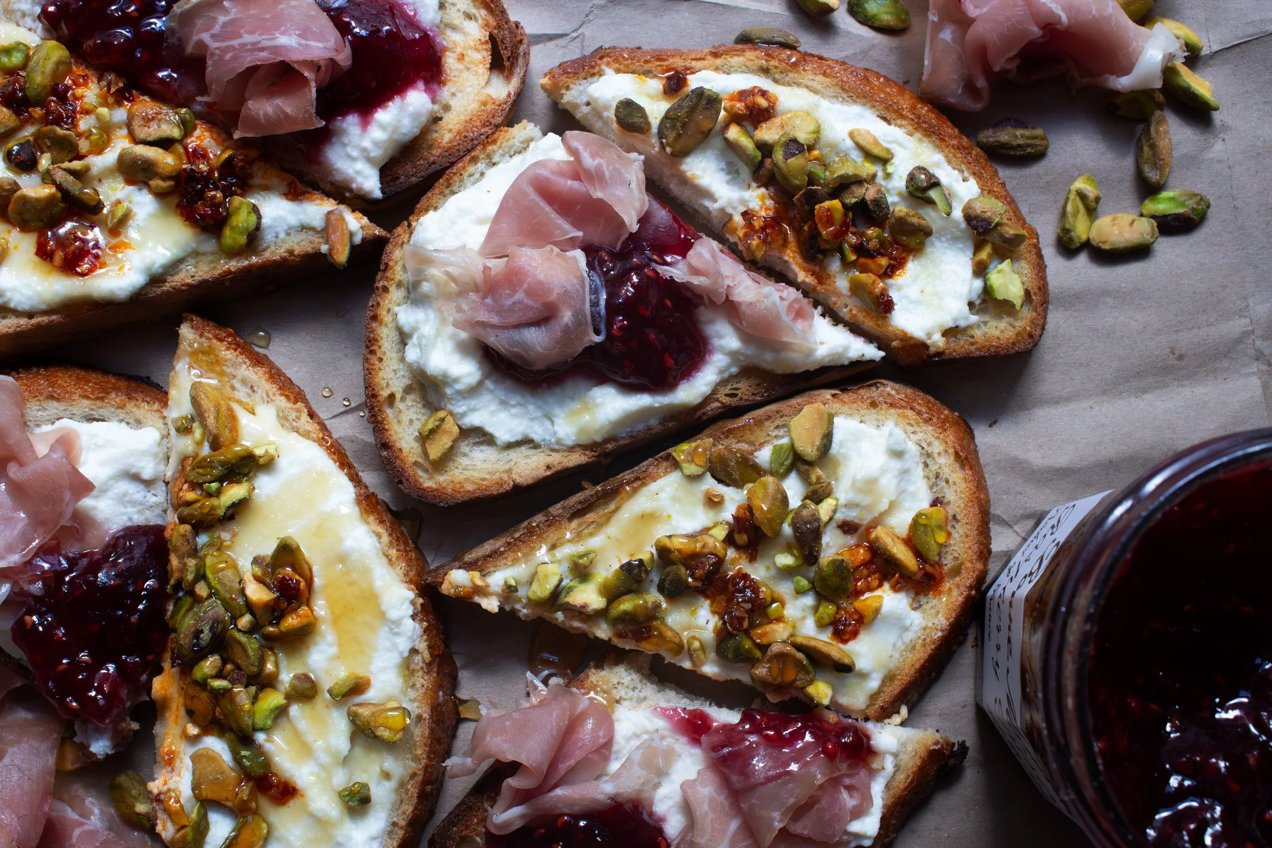 We'll be photographing "toasts" as the final. I'll demo a few recipes in class, purely as examples. Do not follow those recipes—please make up your own! You’ll be constructing three at home, and photograph them as well, keeping in mind the recipe itself, props, styling, and photographic approach (lighting, direction, angle). Each photo must use a different bread and props, and at least one of the three photos has to use a different angle. In other words, each image should look distinctly different.